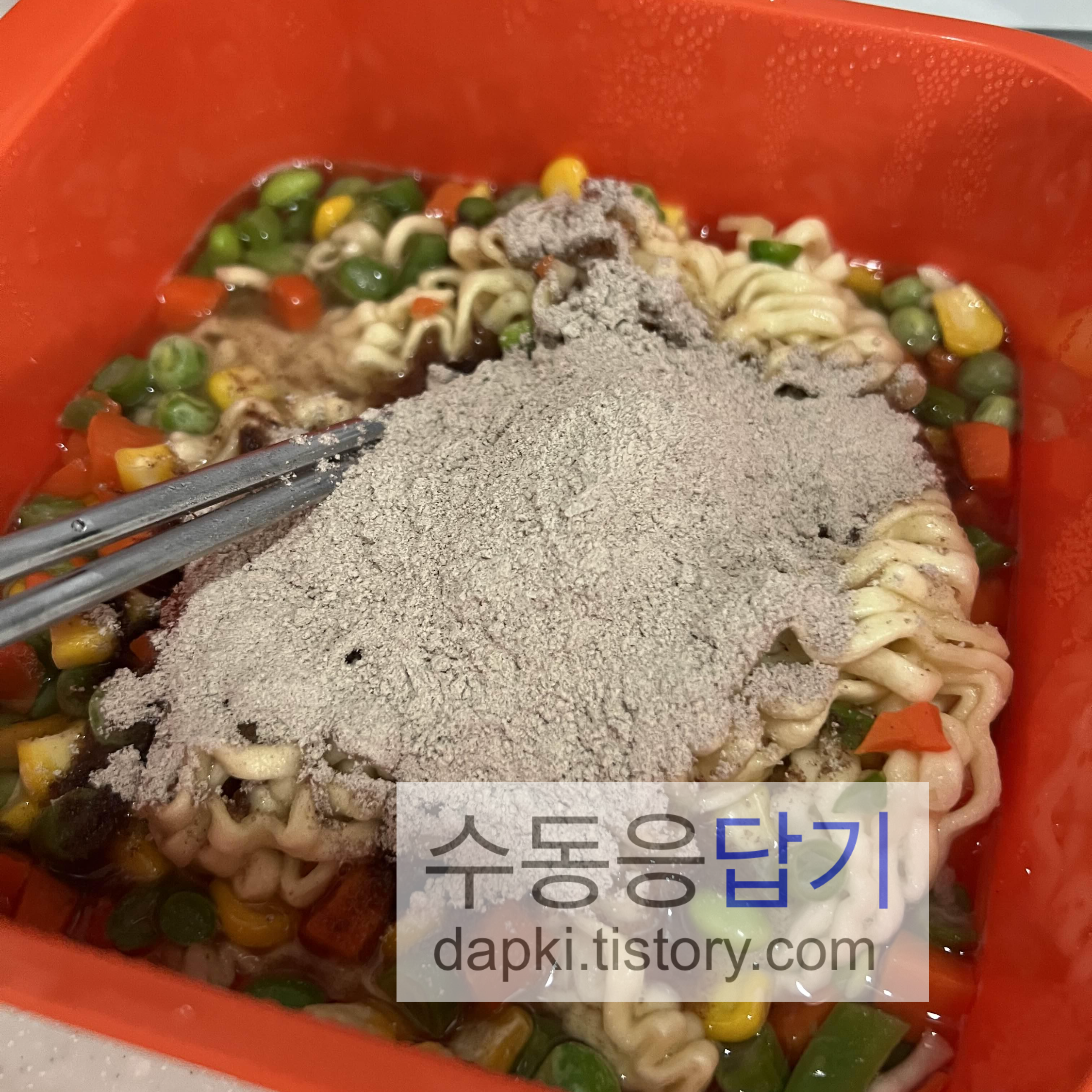 팥가루가 물을 생각보다 빨리 흡수합니다. 그래서 제 생각에는 국수를 깨끗하고 빠르게 섞는 가장 좋은 방법은 국물과 물을 섞은 후 면을 넣는 것입니다. 하지만 귀찮아서 그냥 가루를 붓고 힘차게 섞었습니다. 제가 비빔라면을 먹을 때 물을 많이 빼는 편인데 이 가루가 물을 너무 많이 마셔서 눅눅해졌어요. 그래서 생수를 좀 더 부어서 섞었습니다.