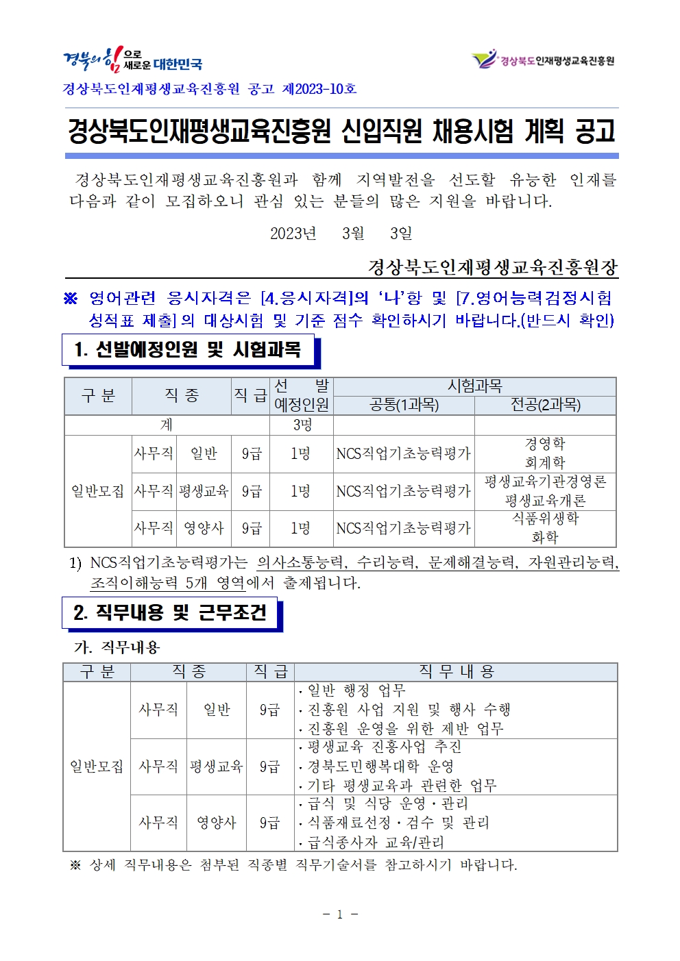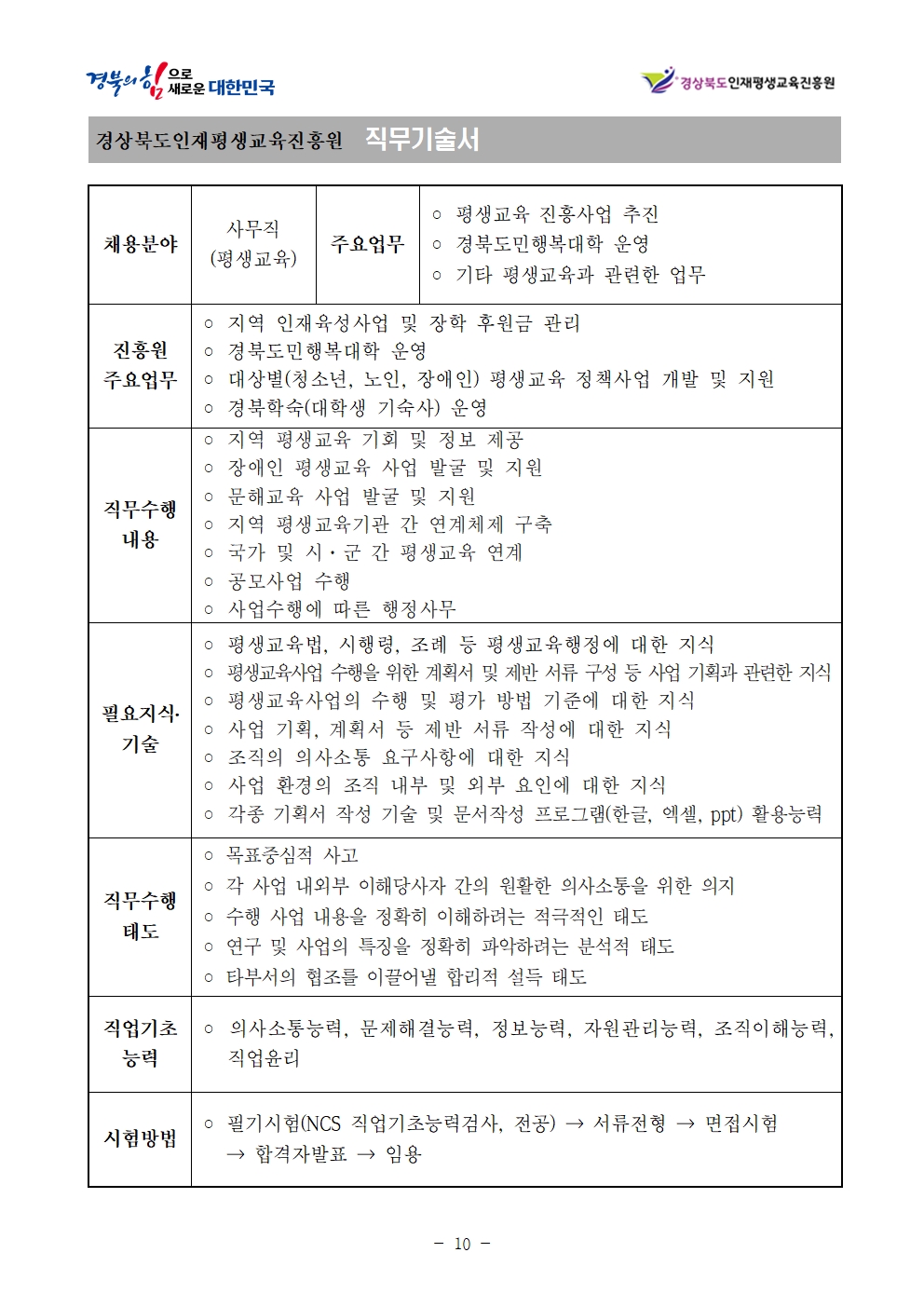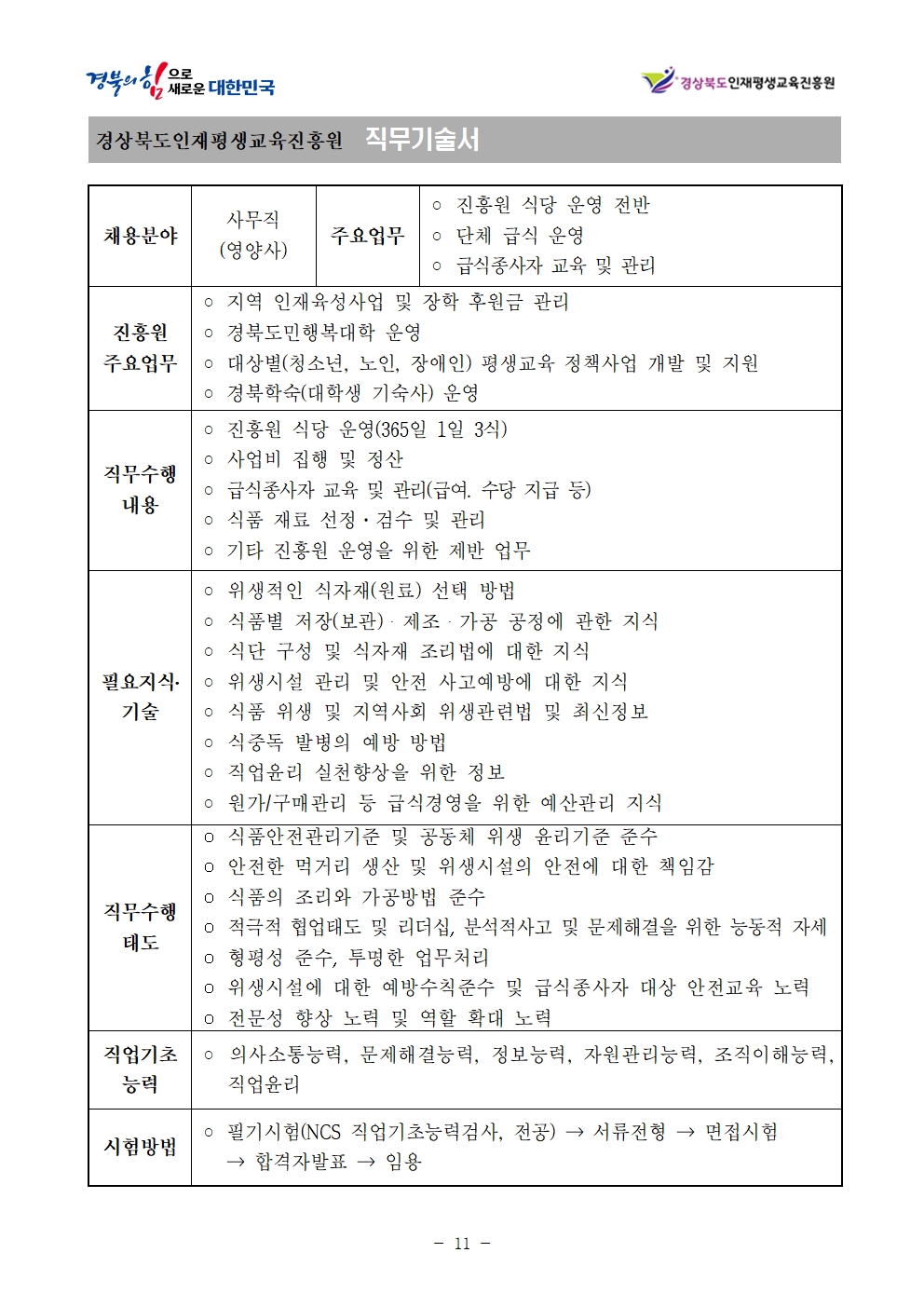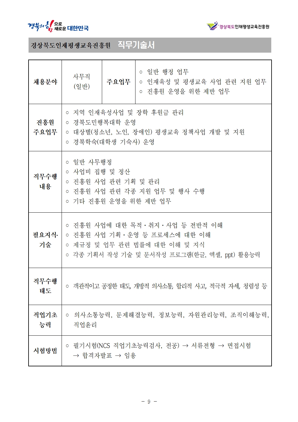 –경상북도 인재육성진흥원 : 신입사원 채용시험 계획 발표–