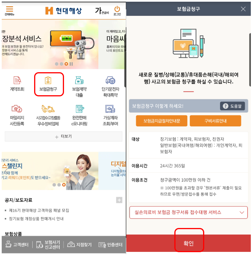 앱은 현대해상을 검색하여 상단에 뜨는 공식앱을 다운받으세요. 2. 홈 화면 중앙의 “질병/상해 보험금 청구”를 누르세요.