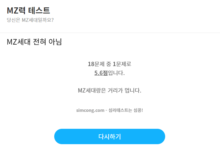 MZ세대인 것이 자랑스럽나요? MZ 강도 테스트MZ 세대는 얼마나 알고 있습니까? 1분이면 알 수 있습니다. 시도 해볼래? SIMCONG 사이트 링크를 남깁니다.